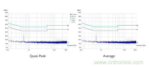 圖 12:MAX17502 EMI 評(píng)估板傳導(dǎo) EMI 測(cè)試結(jié)果。左:準(zhǔn)峰值;右:平均值。