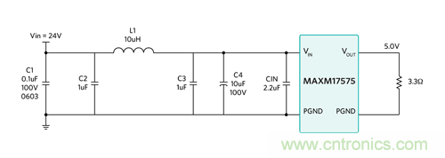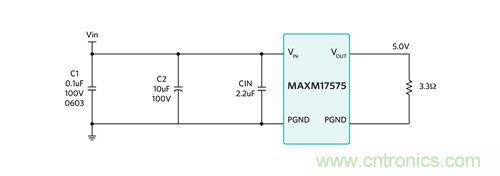 例:以 Maxim 的喜馬拉雅 SiP 電源模塊 MAXM17575 為例,器件采用 4.5-60Vin、0.9-12Vout,提供最大 1.5A 電流。以 MAXM17575 評(píng)估板為例,最小輸入電壓為 7.5V。輸出負(fù)載為 RO = Vo/Io = 5V/1.5A =3.3?。最大工作占空比為 D = VO/VINmin = 5V/7.5V = 0.66。所以,最低可能輸入阻抗為 RIN = RO/D2 = 3.3 ?/0.662 = 7.6?。