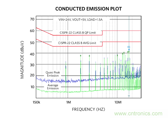 以下為 MAX17502 EMI 評(píng)估板的 EMI 測(cè)試結(jié)果,以非常好的裕量通過了 CISPR 22 標(biāo)準(zhǔn) B 類要求。
