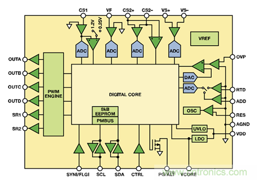 對于數(shù)字控制器來說,所有的控制功能均由數(shù)字邏輯實(shí)現(xiàn)。圖3所示為集成PMBus接口的高級數(shù)字控制器ADP1051的功能框圖。該器件非常適合高密度DC-DC電源轉(zhuǎn)換,具有6個可編程脈沖寬度調(diào)制 (PWM) 輸出,可控制大部分高效電源拓?fù)洹A硗猓撈骷€能控制同步整流 (SR),并集成6個模數(shù)轉(zhuǎn)換器 (ADC),能夠采樣模擬輸入電壓、輸入電流、輸出電壓、輸出電流、溫度以及其它參數(shù)。轉(zhuǎn)換為數(shù)據(jù)后,將這些信號發(fā)送至數(shù)字內(nèi)核模塊進(jìn)行處理。該器件采用靈活的狀態(tài)機(jī)架構(gòu),以硬件實(shí)現(xiàn)全部功能,提供穩(wěn)定可靠的解決方案,但無法通過編程實(shí)現(xiàn)設(shè)計以外的功能。器件的全部功能—包括輸出電壓調(diào)整—均以數(shù)字方式處理。為了調(diào)整輸出電壓,應(yīng)通過PMBus接口發(fā)送一條命令,改變數(shù)字基準(zhǔn)電壓值。