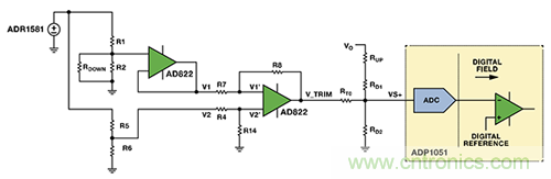 圖5中的電路具有兼容模擬向上或者向下調(diào)壓的功能。兩個電阻分壓器產(chǎn)生兩個基準(zhǔn)電壓,其中一個基準(zhǔn)電壓表示模擬控制器所需的輸出基準(zhǔn)電壓,另一個表示內(nèi)部基準(zhǔn)電壓。利用一個電壓跟隨器來避免所需的輸出基準(zhǔn)電壓與后續(xù)電路相互影響。利用AD822 FET輸入運(yùn)算放大器,將所需的輸出基準(zhǔn)電壓 (V1) 從模擬控制器的內(nèi)部基準(zhǔn)電壓 (V2) 中去除,得到所需的電壓差。此電路的線性放大增益確保了VTRIM足夠大,從而能對VVS+產(chǎn)生影響。