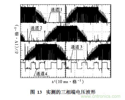 圖13為實(shí)測的三相端電壓波形(通道1~通道3) ,通道4的上升沿和下降沿分別對應(yīng)過零點(diǎn)和換相點(diǎn).