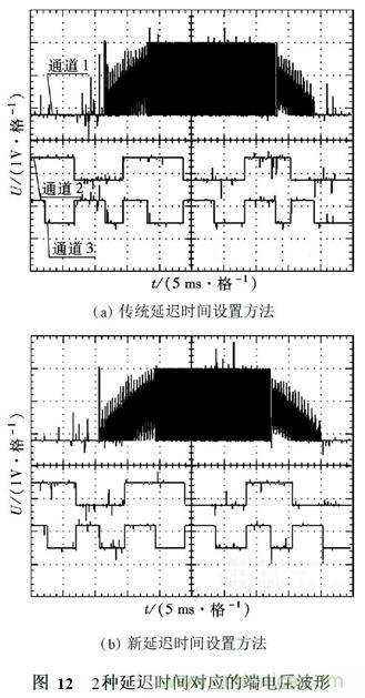 2種延遲時間設(shè)置方法對應(yīng)的實(shí)測端電壓波形(通道1)如圖12所示,通道2和通道3為過零點(diǎn)檢測波形,通道2的上升沿和下降沿對應(yīng)于過零點(diǎn),而通道3的上升沿和下降沿分別對應(yīng)過零點(diǎn)和換相點(diǎn).