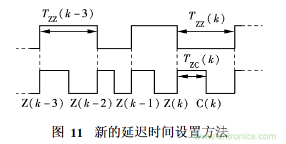 為使換相點(diǎn)位于相鄰2個過零點(diǎn)的中間位置,本文提出一種新的延遲時間設(shè)置方法. 如圖11所示,過零點(diǎn)的間隔時間TZZ ( k - 3)和TZZ ( k)相等,當(dāng)檢測到第k次過零點(diǎn)時,從第k次過零點(diǎn)到第k次換相點(diǎn)的延遲時間tZC ( k)如下設(shè)置:
