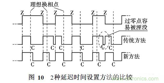 采用傳統(tǒng)的延遲時間設(shè)置方法,某些換相點(diǎn)偏離理想換相點(diǎn)較大. 當(dāng)某次換相嚴(yán)重滯后時,下次過零點(diǎn)容易被湮沒,導(dǎo)致電機(jī)失步,如圖10所示.