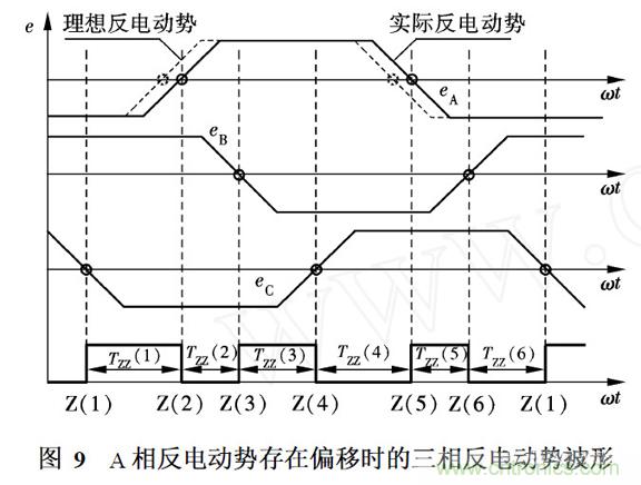 假設(shè)A 相反電動勢存在相位偏移, 波形上升和下降部分上的過零點(diǎn)滯后出現(xiàn),導(dǎo)致過零點(diǎn)在時間軸上分布不均勻. 如圖9所示, 虛線表示理想反電動勢,實(shí)線表示存在相位偏移的實(shí)際反電動勢,過零點(diǎn)的間隔時間TZZ (1) , TZZ ( 2)和TZZ ( 3)不相等. 每相反電動勢波形上升和下降部分的2個過零點(diǎn)相差180°電角度, 過零點(diǎn)間隔時間存在著周期性規(guī)律,如TZZ ( 1) =TZZ ( 4) , TZZ ( 2) = TZZ ( 5)和TZZ (3) = TZZ (6) .