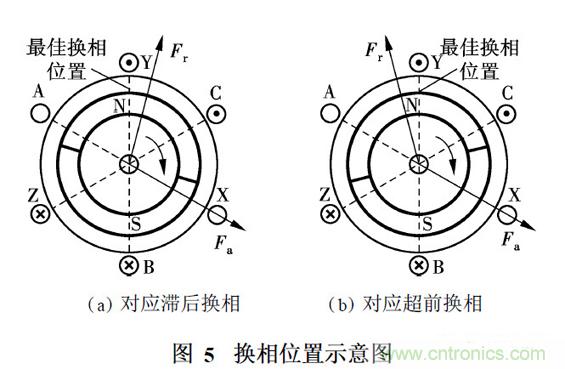最佳換相邏輯是指繞組在梯形波反電勢的平頂部分導(dǎo)通, 與之對應(yīng)的最佳換相位置是指在換相完成后,定子磁勢超前轉(zhuǎn)子磁勢120°電角度,如圖5所示. 其中, Fa 和Fr 分別表示定子磁勢和轉(zhuǎn)子磁勢. 在一個工作狀態(tài)內(nèi)定子磁勢平均超前轉(zhuǎn)子磁勢90°電角度,平均電磁轉(zhuǎn)矩最大.