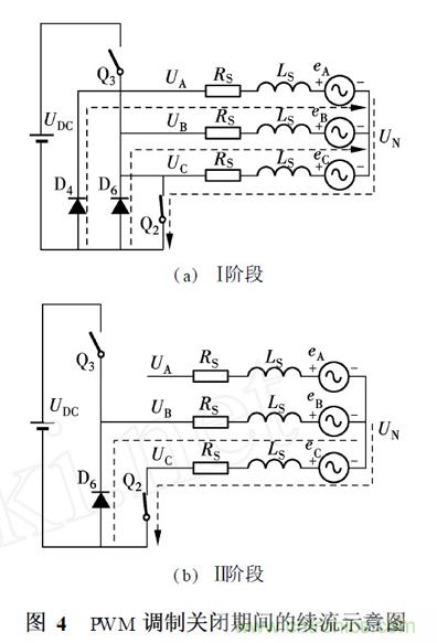 AC 和AB 區(qū)為A 相上橋臂開關(guān)PWM 調(diào)制階段. 以AC區(qū)為例,在PWM 開通期間, Q1 和Q2 導(dǎo)通, A 相繞組與直流側(cè)電壓的正極相連, 端電壓為UDC ;在PWM 關(guān)閉期間, Q1 關(guān)閉, Q2 導(dǎo)通,由于繞組阻抗呈感性, A 相下橋臂的反并聯(lián)二極管D4 導(dǎo)通續(xù)流,此時A 相繞組與直流側(cè)電壓的負(fù)極相連,端電壓為零.