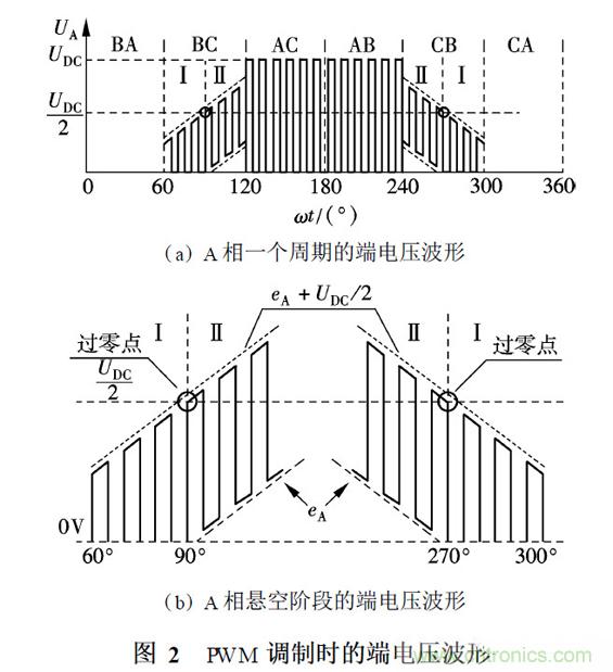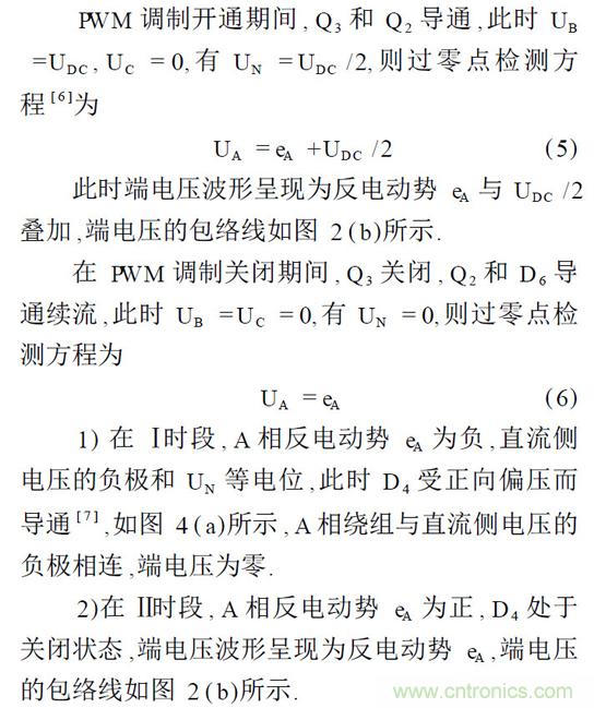 分析了上橋臂PWM 調(diào)制、下橋臂恒通調(diào)制方式時的端電壓波形,討論相應(yīng)的反電動勢過零點(diǎn)檢測方法. 在PWM 調(diào)制信號開通狀態(tài)結(jié)束時刻對端電壓進(jìn)行采樣,由軟件算法確定反電動勢過零點(diǎn). 針對電機(jī)運(yùn)行時存在超前換相或滯后換相的情況,通過設(shè)置合理的延遲時間來實(shí)現(xiàn)最佳換相. 針對實(shí)際電機(jī)存在反電動勢過零點(diǎn)分布不均勻的情況,根據(jù)過零點(diǎn)間隔時間存在著周期性規(guī)律,提出一種新的延遲時間設(shè)置方法,使換相點(diǎn)位于相鄰過零點(diǎn)的中間位置,實(shí)現(xiàn)了電機(jī)的準(zhǔn)確換相. 實(shí)驗驗證了所提出方法的可行性和有效性.