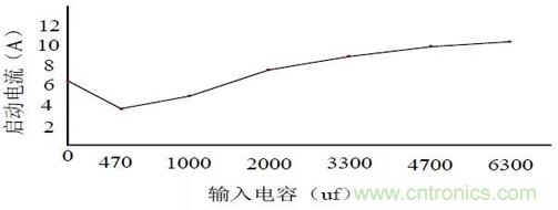 從理論上講,增大電路中的濾波電容 C容量的確可以使輸出電壓的波形變得更為平滑、起伏更小,但在電路接通瞬間,電路中所產(chǎn)生的沖擊電流因素卻不能被忽略;在一些濾波電路的維修中對(duì)濾波電容的替換也存在沖擊電流的問題,在不更換其他元件的前提下,單純提高濾波電容的容量會(huì)使整個(gè)電路的實(shí)際使用壽命大大縮短,甚至燒毀整個(gè)電路。況且,單純地提高濾波電容的容量對(duì)改善輸出電壓的作用也是有限的。做一個(gè)簡單實(shí)驗(yàn)外接不同輸入電容的大小啟動(dòng)時(shí)的電流曲線,如下圖所示為輸入外接電容大小與啟動(dòng)電流的關(guān)系曲線。