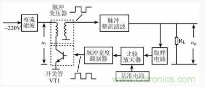 開關(guān)管VT1的工作狀態(tài)受脈沖寬度調(diào)制器輸送來的開關(guān)脈沖信號的控制呈周期性的導(dǎo)通與截止,由此在開關(guān)管集電極上形成脈沖電壓,經(jīng)脈沖變壓器耦合,其次級就可得到相應(yīng)的脈沖電壓,該電壓再經(jīng)脈沖整流濾波電路處理后得到直流輸出電壓uo。
