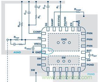 AGND 有時(shí)被稱為 SGND(信號接地層),是其他信號用作參照的接地連接,通常十分平靜。該接地層包括調(diào)節(jié)輸出電壓所需的內(nèi)部基準(zhǔn)電壓。軟啟動(dòng)和使能電壓也以 AGND 連接為參照。