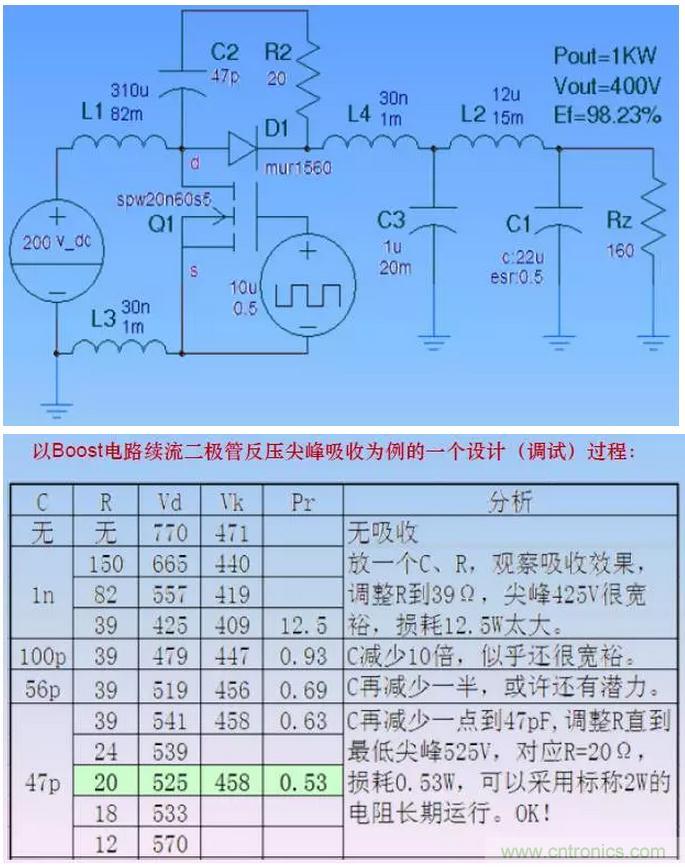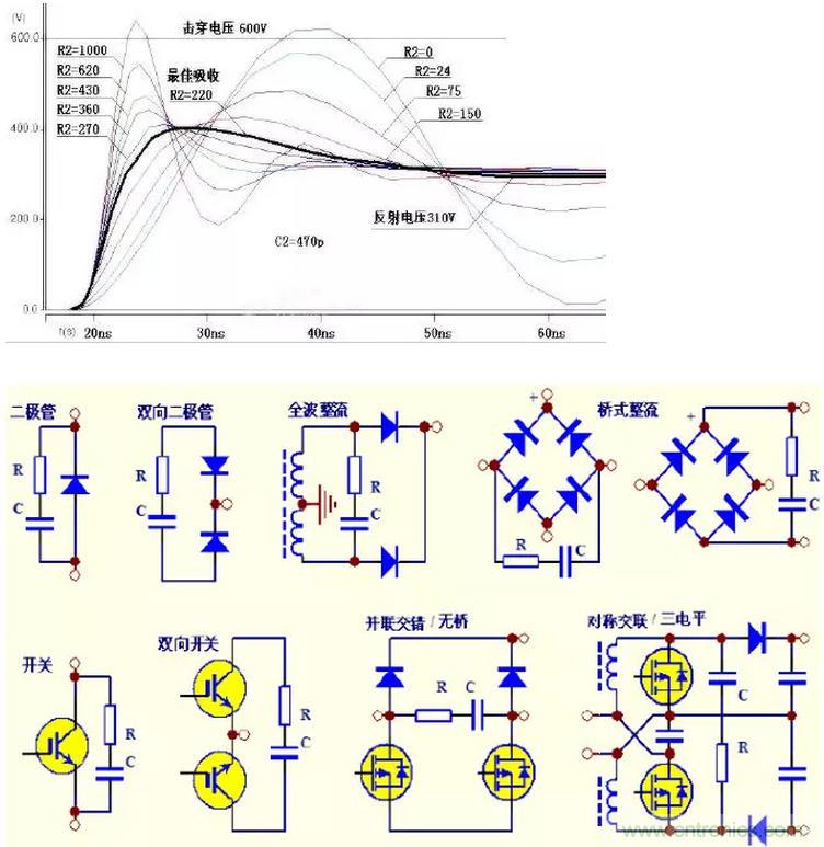 比如對二極管反壓的吸收,即使其他情況完全相同,使用不同的二極管型號需要的RC吸收參數(shù)就可能有很大差距。很難推導出一個通用的計算公式出來。