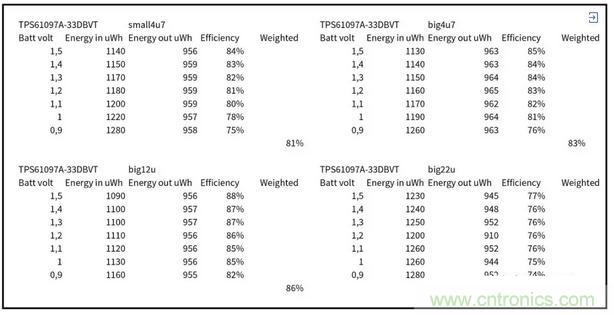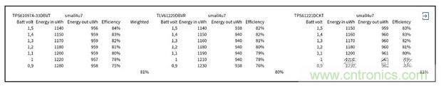Otii工具讓效率計算變得非常簡單,只需將輸出能量除以輸入能量即可,然后根據案例一測量設置中的說明對該效率值進行加權。圖5為所有三個DC/DC轉換器提供了一個概覽。