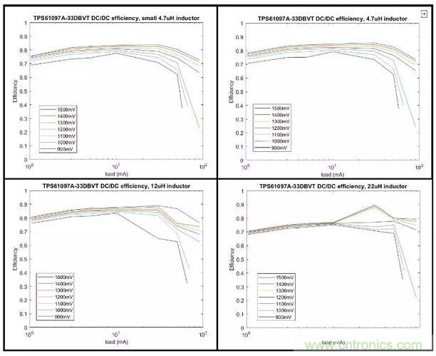 在本文件分析所采用的簡單系統中,三種TI DC/DC轉換器的性能非常相似;之所以選擇TPS61097A-33DBVT,只是因為它采用了SOT23-5封裝。關于電感器選擇,應選擇12μH電感器,因為它具有更高的效率,并且有足夠的空間來使用它。