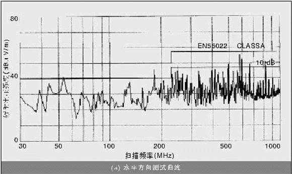 測試環境為電波暗室,測試設備為寬帶天線、頻譜分析儀和信號放大器,天線可以在1 m與4 m高度范圍內升降,被測產品放置在一個可360°旋轉的平臺上,距離天線3 m。測量時轉動平臺,升降天線找到最大干擾,天線測量取水平和垂直兩種極化。