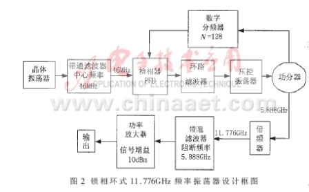 在該頻率振蕩器系統(tǒng)中,利用高穩(wěn)定晶體振蕩源輸出信號經(jīng)過中心頻率為46MHz帶通濾波器,提供一個高精確的穩(wěn)定參考信號至檢相器,鎖相環(huán)路分頻計數(shù)器設置為128,達到鎖相后VCO輸出5.888GHz固定點頻信號,再經(jīng)過高頻電路倍頻獲得11.776GHz的二次諧波。由于采用的倍頻器基波抑制性能較差,需要通過阻帶濾波和功率放大獲得足夠功率的高穩(wěn)定低相位噪聲的高純度11.776GHz振蕩信號。圖2為整個頻率振蕩器系統(tǒng)的設計框架。