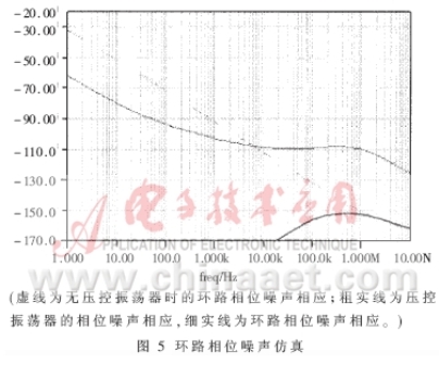 可見分頻式鎖相環(huán)路對于輸入信號、分頻器、檢相器的附加相位噪聲呈低通特性,對于壓控振蕩器的相位噪聲呈高通特性。環(huán)路相位噪聲仿真結果與該結論相符,見圖5。與普通倍頻器件相似,“低通型”的噪聲通過分頻鎖相環(huán)會增加N2倍,輸入?yún)⒖夹盘杹碜苑€(wěn)定信源,其信噪比較高,而分頻器輸出端很小的近旁頻信號在經(jīng)過