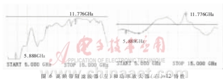 的連接線。濾波后采用低耗能的射頻放大器對信號進行功率放大以彌補濾波器的通帶衰減。功率放大器電路設計主要是隔直電路的設計,選用一級耦合微帶作為隔直電路,對11.776GHz信號增益可以達到10dB左右。圖6給出了用網(wǎng)絡分析儀測得的帶阻濾波器和功率放大器的s12特性。