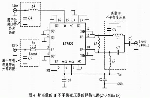 750 MHz以下的LO輸入匹配要求串聯電感L/4并聯電容C4,在650 MHz~830 MHz,其匹配網絡的L4=3.9 nH,C4=5.6 pF;在540 MHz~640MHz,其匹配網絡的L4=6.8 nH,C4=10 pF。評估板不包含L4的焊盤,因此可切斷近處的引腳15以便插入L4,L4是低功耗多層片式電感器。