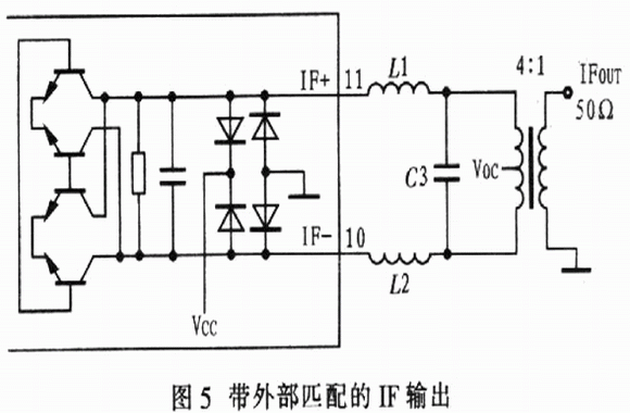 圖3示出由混合變壓器構成的lF匹配電路,以達到最低LO-IF泄漏和最寬的IF帶寬。圖4示出由1個離散的IF不平衡變壓器代替IF變壓器的電路,以降低成本和縮小尺寸,盡管離散的IF不平衡變壓器也有較理想的噪聲系數、線性度及較高的轉換增益,但是LO-IF泄漏降低,IF的帶寬減小。