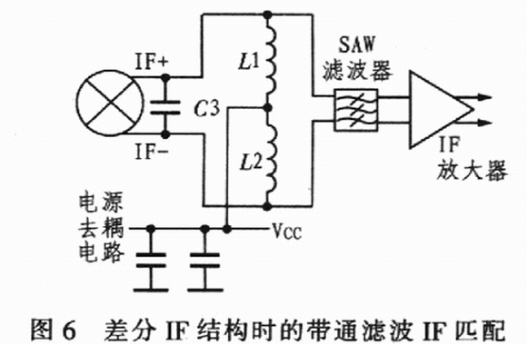 對整個差分IF結構來說,還可以從另一個角度考慮,不用IF變壓器,如圖6所示,這里,混頻器的lF輸出匹配直接通過1個SAW濾波器,混頻器IF端的電源由IF匹配網絡中的電感器提供。計算Ll、L22和C3的值,使之在期望的IF頻率上諧振,并獲得高品質因數和理想帶寬。調整L和C值,以消除混頻器內部2.5 pF電容和SAW濾波器輸入電容的影響。在這種情況下,由于帶通網絡不變換阻抗,其差分lF輸出阻抗是400Ω。若SAW濾波器的輸入阻抗大于或小于 400 Ω,就需要附加匹配元件。
