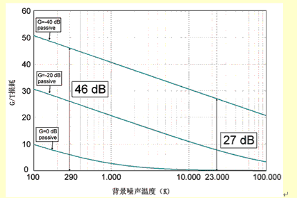 在實際應用中,除了受天線特性的影響,有兩個外來的因素會影響G/T損失的數值:接收器的噪聲指數和環境噪聲溫度Ta。接收器的噪聲指數會增大天線的輸出噪聲Tout(因而降低G/T),環境噪聲溫度也會增大輸出噪聲。