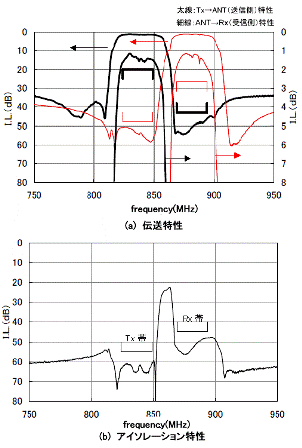 舉例來說,圖1所示的是BAND5(800MHz )收發雙工器(產品尺寸2.5×2.0×0.6mm)的傳輸特性以及隔離度。一般的隔離度和過濾性的損耗是相互制約的關系,但本產品對于Tx頻段能實現60dB的高隔離度,同時使Rx損耗維持在1.8dB。