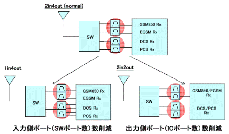 在手機的高頻率無線通信電路中使用的表面波濾波器,分為CDMA收發用的級間濾波器和GSM用的TOP濾波器等。村田的濾波器不僅具有低損耗和高抑制度的電特性,還由小型、薄型的各種產品尺寸構成了豐富的商品線,可以對應各種電路設計的需求。例如, 在多頻段發展的高頻無線通信電路中,為了減小電路基板上的貼裝面積,將兩個頻帶的單濾波器(產品尺寸1.35×1.05×0.5mm)合二為一,制造出了雙濾波器(產品尺寸1.8×1.35×0.5mm)。此外還運用特殊的技術制造許多獨特的商品,如將雙層濾波器的輸入端合并為一個的1in4out產品,以及將平衡器的輸出端合并為一的2in2out產品等。通過共用輸入端可以節省原本用于分頻的開關(SW)。同時,共用平衡輸出端可以使連接濾波器的高頻IC的端口數目減少(圖3)。這是在表面波濾波器的設計中通過調整阻抗和相位等方法,從而使差分端口實現共用。這些濾波器可以在多頻帶化發展的高頻無線電路中,為外圍電路的簡化及電路整體的小型化做出貢獻。今后村田制作所將繼續致力于研發更小型化和高性能化,同時又具有輸入端以及輸出端共用功能的單濾波器、雙濾波器產品。