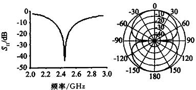 半波偶極子天線模型如圖4a所示.天線采用銅材料(電導率:5.8e7s/m,磁導率:1),位于充滿空氣的立方體中心.在立方體外表面設定輻射吸收邊界.輸入信號由天線中心處饋入,也就是RFID芯片的所在位置.對于2.45GHz的工作頻率其半波長度約為61mm,設偶極子天線臂寬w為1mm,且無限薄,由于天線臂寬的影響,要求實際的半波偶極子天線長度為57mm.在AnsoftHFSS工具平臺上,采用有限元算法對該天線進行仿真,獲得的輸入回波損耗S11分布圖如圖5a所示,輻射場E面(即最大輻射方向和電場矢量所在的平面)方向圖如圖5b所示.天線輸入阻抗約為72Ω,電壓駐波比(VSWR)小于2.0時的阻抗帶寬為14.3%,天線增益為1.8.