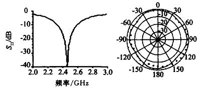 從圖5b可以看到在天線軸方向上,天線幾乎無輻射.如果此時讀寫器處于該方向上,應答器將不會做出任何反應.為了獲得全方位輻射的天線以克服該缺點,可以對天線做適當的變形,如在將偶極子天線臂末端垂直方向上延長λ/4成圖4c所示.這樣天線總長度修改為(57.0mm+2×28.5mm),天線臂寬仍然為1mm.天線臂延長λ/4后,整個天線諧振于1個波長,而非原來的半個波長.這就使得天線的輸入阻抗大大地增加,仿真計算結果約為2kΩ.其輸入回波損耗S11如圖6a所示.圖6b為E面(天線平面)上的輻射場方向圖,其中實線為仿真結果,黑點為實際樣品測量數據,兩者結果較為吻合說明了該設計是正確的.從圖6b可以看到在原來弱輻射的方向上得到了很大的改善,其輻射已經近似為全方向的了.電壓駐波比(VSWR)小于2.0時的阻抗帶寬為12.2%,增益為1.4,對于大部分RFID應用系統,該偶極子天線可以滿足要求.
