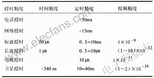 衛星授時GPS導航系統:提供的時間信號對世界協調時跟蹤,精度優于100ns。GPS全球覆蓋,接收設備體積小,可以接收6顆衛星信號,可用來提供2.048Mbit/s基準時間信號。俄羅斯的GLONASS衛星導航系統:目前系統未完成完善,接收設備商業化不夠。中國的北斗導航系統:精度達到50ns,目前覆蓋中國,同步衛星信號接收設備體積較大,系統還未建成。(3)網絡授時:通過互聯網授時。使用NTP(NetworkTimeProtocol,網絡時間協議,RFC1305)。(4)電話授時:通過公共電話網,用戶用調制解調器接首時間信號。(5)電視授時:通過電視網授時。(6)電信有線傳輸網授時表1是授時精度比較表1