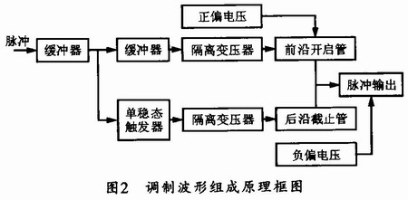 本調制器的組成原理框圖如圖2所示。圖中,當定時脈沖輸入到來時,經過緩沖器驅動后,該脈沖將分成兩路,分別提供給調制脈沖前沿開啟和后沿截止MOS管。其中前沿開啟脈沖經緩沖器驅動和三極管放大后,加到隔離升壓變壓器,以保證高速開啟管正常開啟;而后沿截止脈沖則使用后沿觸發的單穩態觸發電路形成,以保證形成的調制脈沖的寬度與定時脈沖的寬度一致。
