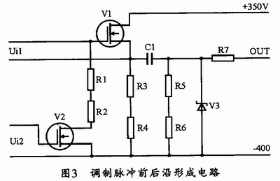 本調制器的調制脈沖前后沿形成使用的是BUZ50B,當Ui2使得V2導通時,負偏電壓將使V1迅速截止。這樣形成的調制脈沖就能夠具有非常良好的后沿波形。其電路圖如圖3所示。