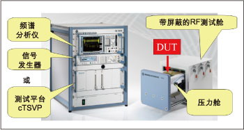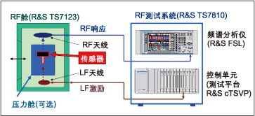 壓力艙模擬RF測試艙內部的胎壓。一個波形發生器以125kHz LF數據電報激勵胎壓傳感器發送數據(ID號碼、壓力和溫度)。該RF數據電報由測試艙中的ISM天線拾取并在頻譜分析儀中解調。其系統軟件可評估該信息并給出GO/NoGo信息。