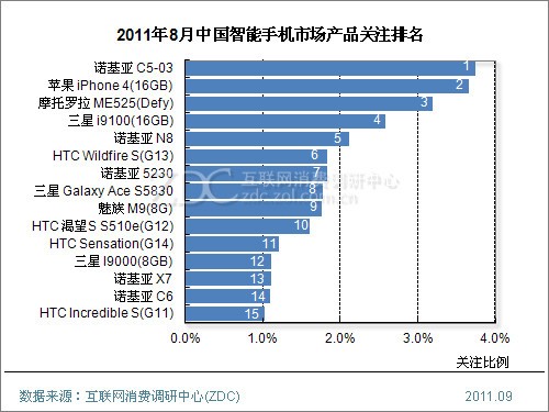 (圖)2011年8月中國智能手機(jī)市場產(chǎn)品關(guān)注排名