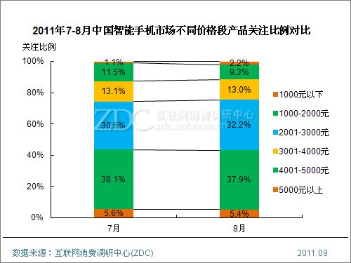 (圖)2011年7-8月中國智能手機(jī)市場不同價(jià)格段產(chǎn)品關(guān)注比例對(duì)比