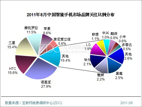 (圖)2011年8月中國智能手機(jī)市場品牌關(guān)注比例分布