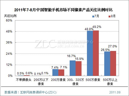 (圖)2011年7-8月中國智能手機(jī)市場不同像素產(chǎn)品關(guān)注比例對(duì)比