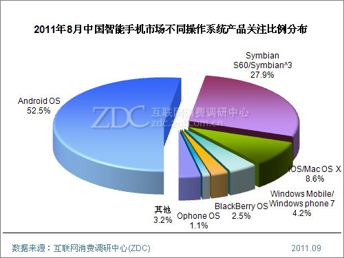 ZDC數(shù)據(jù)顯示,2011年8月中國智能手機(jī)市場上,搭載Android操作系統(tǒng)的智能手機(jī)用戶關(guān)注度已經(jīng)達(dá)到52.5%,較上月再度攀升2個(gè)百分點(diǎn)。而諾基亞Symbian系統(tǒng)智能手機(jī)的關(guān)注度則持續(xù)下滑,本月跌破三成。其他操作系統(tǒng)產(chǎn)品關(guān)注比例變動(dòng)幅度不大。