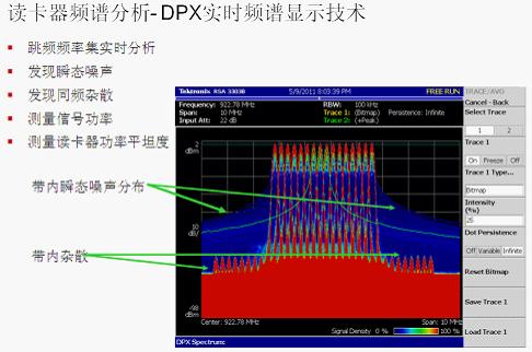 圖4:泰克RTSA集成的DPX實時頻譜顯示技術(shù)非常適合RFID的讀寫器頻譜分析。
