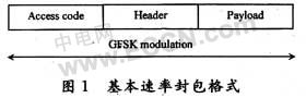 藍牙v1.2基帶數據封包中包含了存取碼、標頭、保護時段(guard band)和負載(payload),如圖1所示。基本速率調變指的是GFSK,數據會以每個符號攜帶一個位元的方式,在1 Mb/s的資料速率下進行傳輸,因此符號速率為1 Ms/s。資料會利用最小115 kHz的載波頻率中的位移或偏差,在RF載波上調變。高斯脈沖波形將-20 dB的頻寬維持1 MHz,頻譜利用率比BFSK高一倍。