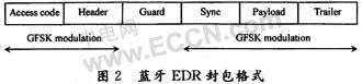 藍牙v2.0 EDR封包先在存取碼和標頭的部分使用GFSK調變模式,但是,在保護時間5μs之后,負載部分則用π/4-DQPSK或8DPSK調變模式,如圖2所示。在保持指定的1 Ms/s符號速率前提下,增強速率分別提升資料速率到2 Mb/s或3 Mb/s,即每個符號發射二到三位碼元。通過測試發現結果,在封包的GFSK調變部分振幅顯得相當固定,但在DPSK調變波形中振幅卻有較大的波動。