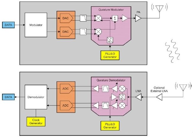 典型的低功耗無線鏈路由一個發(fā)送器件和一個或多個接收器件組成。發(fā)送器件由一個調(diào)制器、合成器、升頻混頻器和一個功率放大器(PA)組成。接收機由互逆器件、低噪聲放大器(LNA)、降頻混頻器、合成器和解調(diào)器組成。