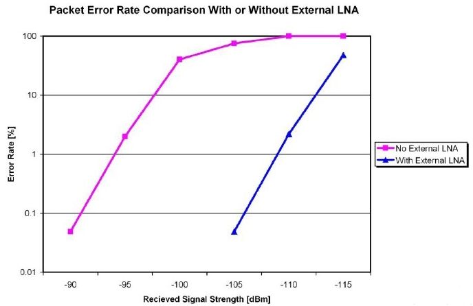 圖2:有/無外部LNA的低功耗無線接收機的誤包率對比。本例中實現(xiàn)了15dB的增益改善。