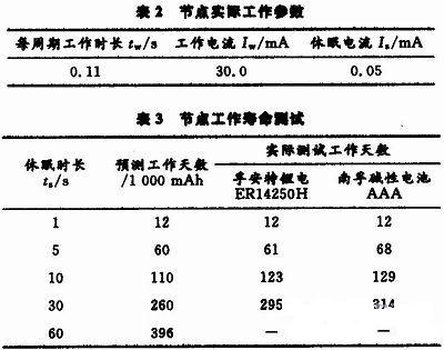 通過(guò)測(cè)試獲取節(jié)點(diǎn)工作參數(shù)如表2所示,工作電壓為3.3 V。可知,節(jié)點(diǎn)工作時(shí)流耗大,在休眠狀態(tài)則小得多。因此,為保證在供電電量有限的情況下獲得更長(zhǎng)的工作壽命,有必要將節(jié)點(diǎn)設(shè)置為間歇式工作模式,即工作休眠周期性交替進(jìn)行。下式為節(jié)點(diǎn)壽命預(yù)測(cè)公式: