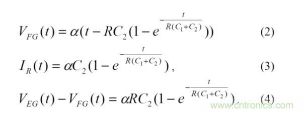 圖5顯示了SuperFlash單元的簡化R-C圖及其等效電路。其中,C1為EG-FG電容,C2為總FG電容與CFG-EG的差值,R為有效隧穿電阻。VEG線性斜坡(VEG=αt)和歐姆電阻R組成的等效電路中的瞬變具有簡單的閉環解決方案:
