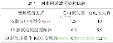 為了將諧波產(chǎn)生的種種干擾防患于未然,應該在發(fā)生源(變頻器)側(cè)抵制高次諧波。首先主電路可選擇采用多脈沖數(shù)整流、多電平輸出形式,諧波少對電網(wǎng)的污染也小,如表1 所列。從表中看出主電路整流脈波數(shù)多三電平輸出可達到高標準的要求。還可采用動態(tài)消除諧波的方法,當然成本就會增加,但要比較權(quán)衡。