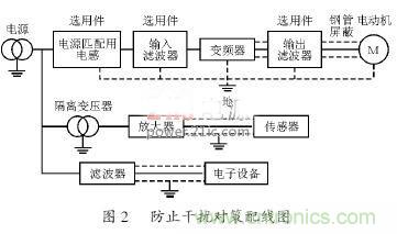 為了防止干擾,采用圖圓所示的方案。變頻器本身用鐵殼屏蔽,輸出線用鋼管屏蔽,并與其它弱電信號分別配線,附近的其它靈敏電子設備線路也要屏蔽;為了減少電磁噪聲,可以配置輸出濾波器;為了減少對電源的污染,可配置輸入濾波器或零序電感,還可與晶閘管整流裝置,功率因數(shù)補償器并聯(lián)使用。電源變壓器容量大于10倍變頻器容量,或電源電壓不平衡率超過3豫時需接電源匹配用電感器,采用電感后對電源改善效果良好,小容量變頻器安裝有匹配電感時使功率因數(shù)有提高,大容量時雖對功率因數(shù)無提高,但可改善變頻器運行,同時起到濾波作用。