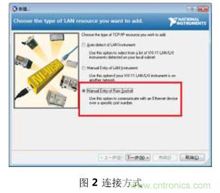 啟動Masurement & Automation Explorer 軟件,選擇設備和接口,在添加網絡設備中,使用Manual Entry of Raw Scoket(手動輸入原始SOCKET)方式連接,ZDS2024 示波器采用端口號5025 來接收SCPI 命令。如圖2和圖3所示。設置好后,可進行測試,確保連接成功。